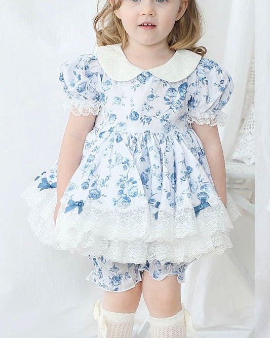 Stylish Two-Piece White and Blue Floral Cotton Dress / Girls / 1 - 7 years old | Soft outfit perfect for casual to semi-formal occasions /