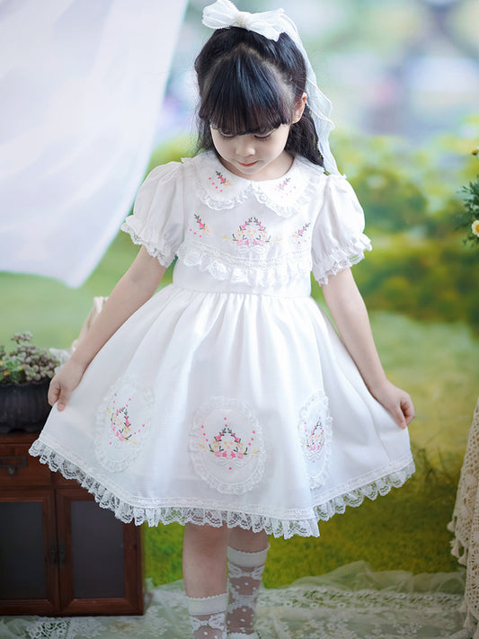 A white-waisted poplin dress with a floral accent / Classic dress for all occasions / 1-7 Years, White, Elegant, Soft, Lightweight